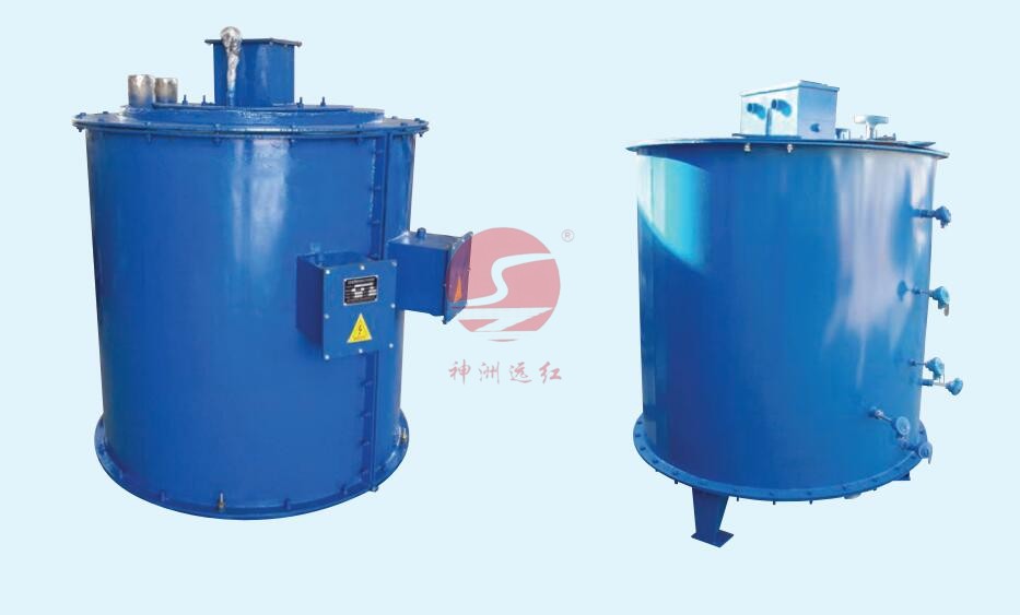 該型號加熱裝置主要對”搪瓷反應釜”加熱,該加熱形式配備了降風管,針對反應釜膽內無法安裝蛇管降溫時而專門設計的 加熱結構形式,在加熱裝置外部上、下各安裝一對進出風口,通過鼓風機將室外空氣抽進到加熱裝置內,再通過出風口將加熱裝 置內部熱量排到室外去,可根據物料所需的降溫速度配套相應功率的鼓風機和風管口徑,其降溫形式既起到降溫效果,同時又 起到防止過熱保護搪瓷的作用,鼓風機開關可與溫控柜連鎖控制