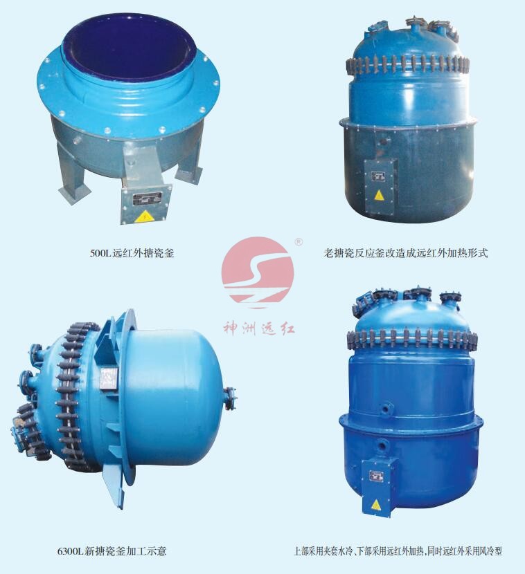 T/GF-M型搪瓷釜用遠紅外加熱系列裝置主要對”搪瓷反應釜”加熱,T/GF-M型500L/6300L遠紅外搪瓷反應釜形式配備了降風管,針對反應釜膽內無法安裝蛇管降溫時而專門設計的 加熱結構形式,在加熱裝置外部上、下各安裝一對進出風口,通過鼓風機將室外空氣抽進到加熱裝置內,再通過出風口將加熱裝 置內部熱量排到室外去,可根據物料所需的降溫速度配套相應功率的鼓風機和風管口徑,其降溫形式既起到降溫效果,同時又 起到防止過熱保護搪瓷的作用,鼓風機開關可與溫控柜連鎖控制